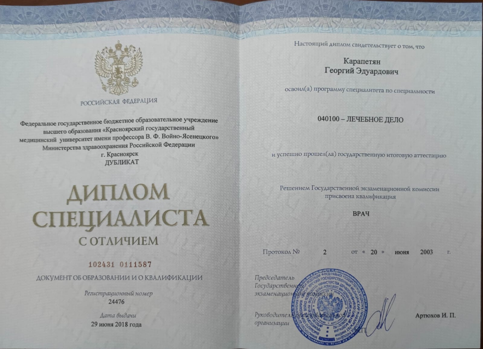 В 2003 году – с отличием окончил Красноярскую государственную медицинскую академию по специальности «Лечебное дело».