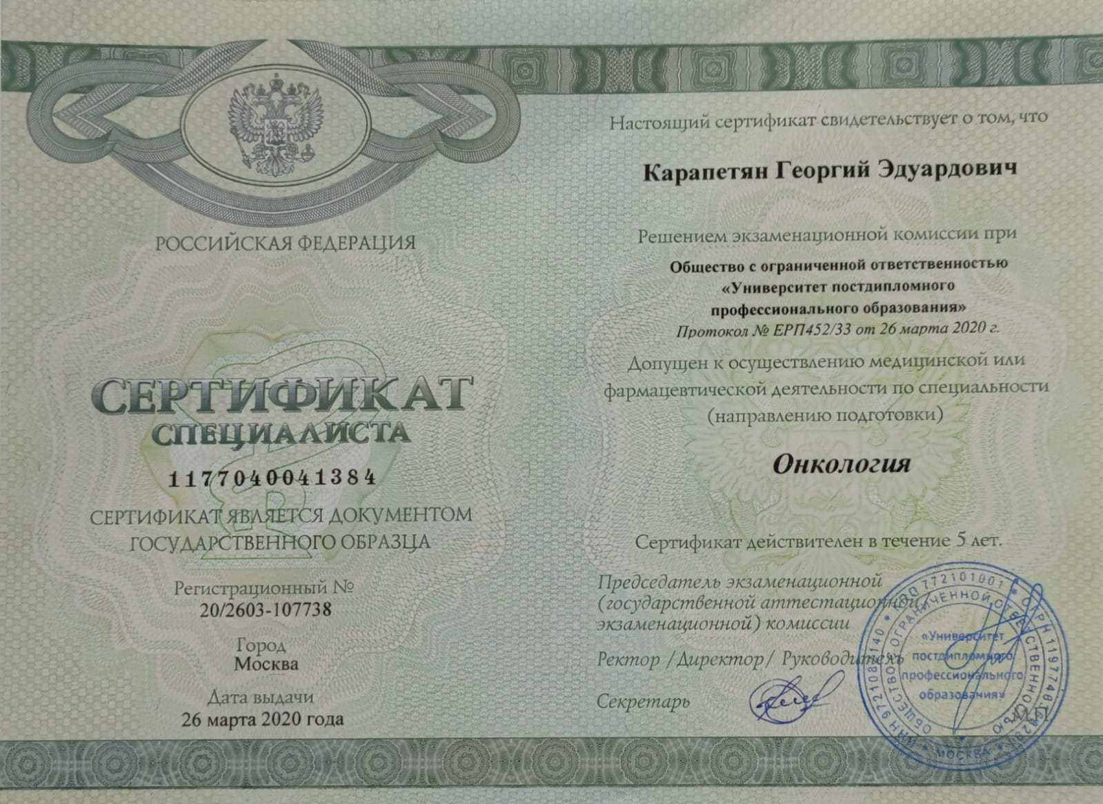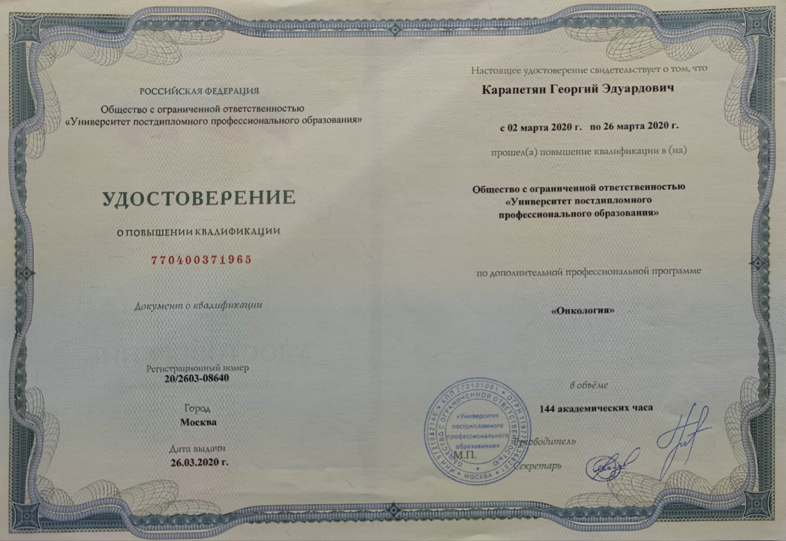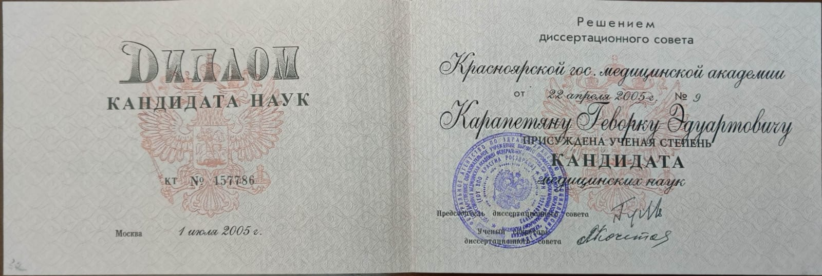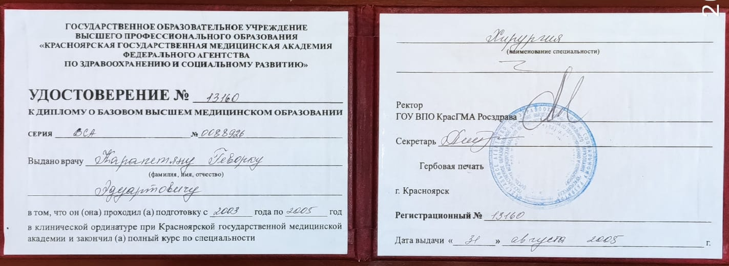 В 2005 году – окончил клиническую ординатуру на кафедре общей хирургии по специальности «Хирургия».